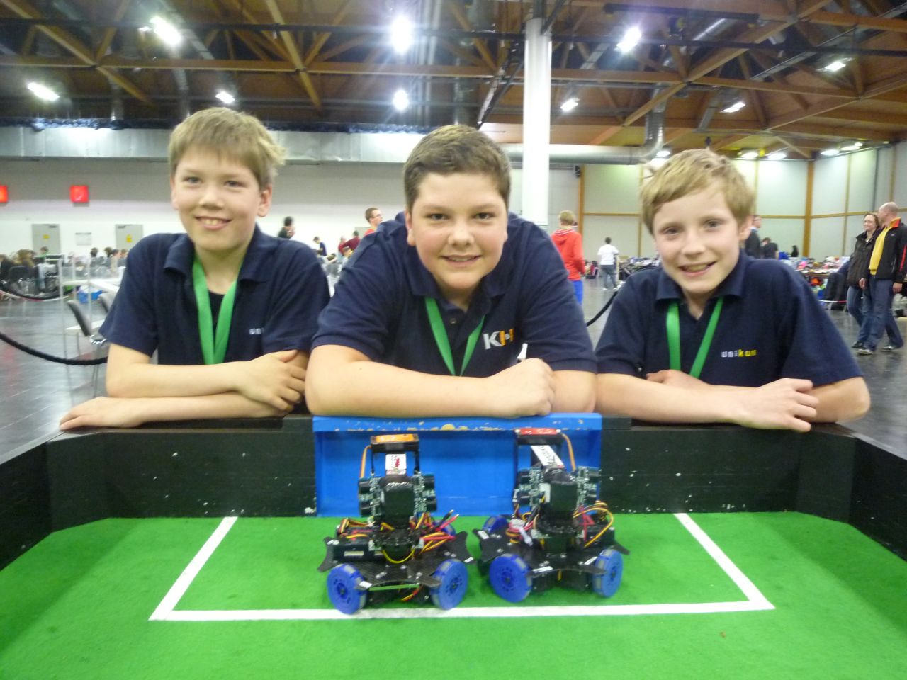 Doch nun zu den Jüngsten im Helmbrechtser Robotikteam. Genau wie auf der Qualifikation in Vöhringen landeten sie einen Kantersieg nach dem anderen. Keiner der Gegner hatte eine Chance gegen die schnellen und agressiv spielenden kleinen Roboter von Goalforce. Selbst im Finale gewannen die drei Youngsters mit 10:0. Insgesamt wurden nur 2 Gegentore gegen unser Primary Team (bis 14 Jahre) geschossen. Die Roboter funktionierten prächtig und ohne große technischen Probleme. Stolz konnten die drei Jungs dann bei der Siegerehrung ihren Pokal in Empfang nehmen.