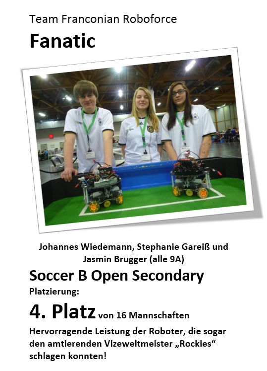 Jubeln konnte das Team Fanatic, denn es landete einen Kantersieg gegen den übermächtig erscheinenden letztjährigen Vizeweltmeister und amtierenden Deutschen Meister "Die Rockies". Diese Niederlage raubte den Rockies die Chance zur WM zu fahren. Die Fanatic-Roboter hielten hervorragend auch gegen die schnellsten Gegner stand. Mit harten Distanzschüssen schossen sie wunderschöne Tore, waren aber letzlich einen Tick zu langsam für die mit Elektronik vollgepackten Gegner. Am Ende stand ein hervorragender 4. Platz zu Buche. Ein Riesenerfolg für die erst 15-jährigen Schüler und Schülerinnen, die sich nun endgültig in der deutschen Spitze einen Namen gemacht haben.