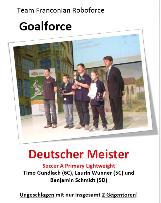 Ende Juni werden sich die Jungs von FRF Goalforce nun gegen die internationale Konkurrenz stellen. Die Teilnahme an einer Weltmeisterschaft gleich im ersten Jahr ihrer Robotikkarriere ist natürlich etwas ganz Besonderes. Die nächsten zwei Monate werden also mit Verbesserungen am Roboter verbracht. Diese sind nötig, da bei der WM auf einem neuen Spielfeld ohne Bande gespielt wird. Auch wurden einige Spielregeln geändert. Man kann gespannt sein, wie unsere kleinen Robotertüftler bei der WM abschneiden werden...